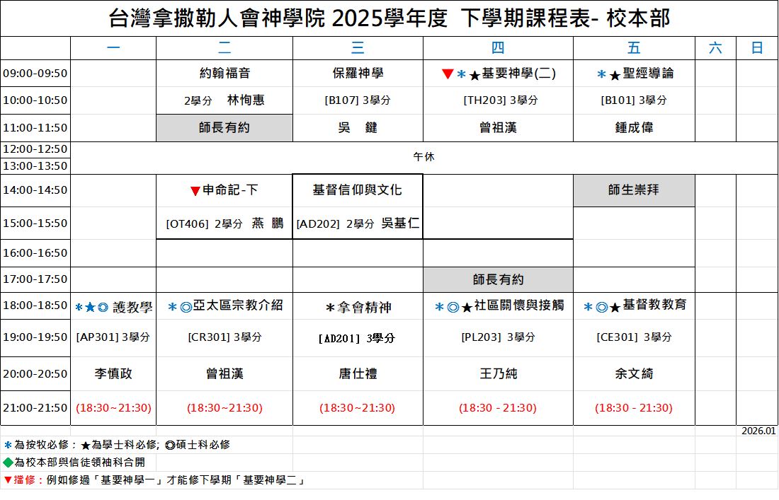 2025學年度-下學期課表 於2025.12.29開放Moodle系統選課